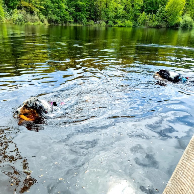 Ein besonderes Highlight war der Rammsee. Dort fanden wir einen kleinen Steg und eine idyllische Badestelle, die vor allem unsere Hunde mit Begeisterung nutzten. Abby war kaum zu bremsen und genoss das Wasser in vollen Zügen – ein Moment voller Lebensfreude, der uns alle ansteckte. Dort gab es auch eine kleine Hütte mit Tisch und Bänken, wo wir eine kleine Rast gemacht haben.